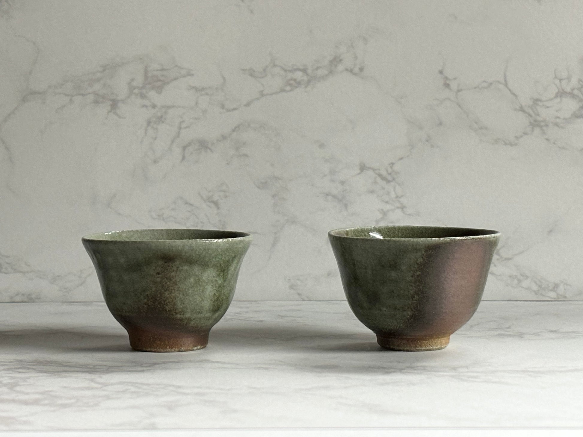 Small, light and delicate sake cups. The natural glaze is greenish and glossy, making them remarkably beautiful pieces despite their small size. The top is slightly open, and the rim is smooth and thin, providing an elegant drinking experience. It's perfect for enjoying a crisp, chilled Junmai Daiginjo Sake. Offered as a pair.