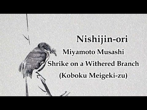 The masterpiece, painted by the dual-sword wielding swordsman Miyamoto Musashi, has been woven into a textile artwork and prepared as a hanging scroll. At first glance, it appears to be a tranquil scene, but viewed through the eyes of a martial artist who also honed his skills in calligraphy and painting as a means to refine his martial techniques, it captures the tension of the moment, where the shrike stares sharply without flinching, and the insect slowly crawls up the branch.