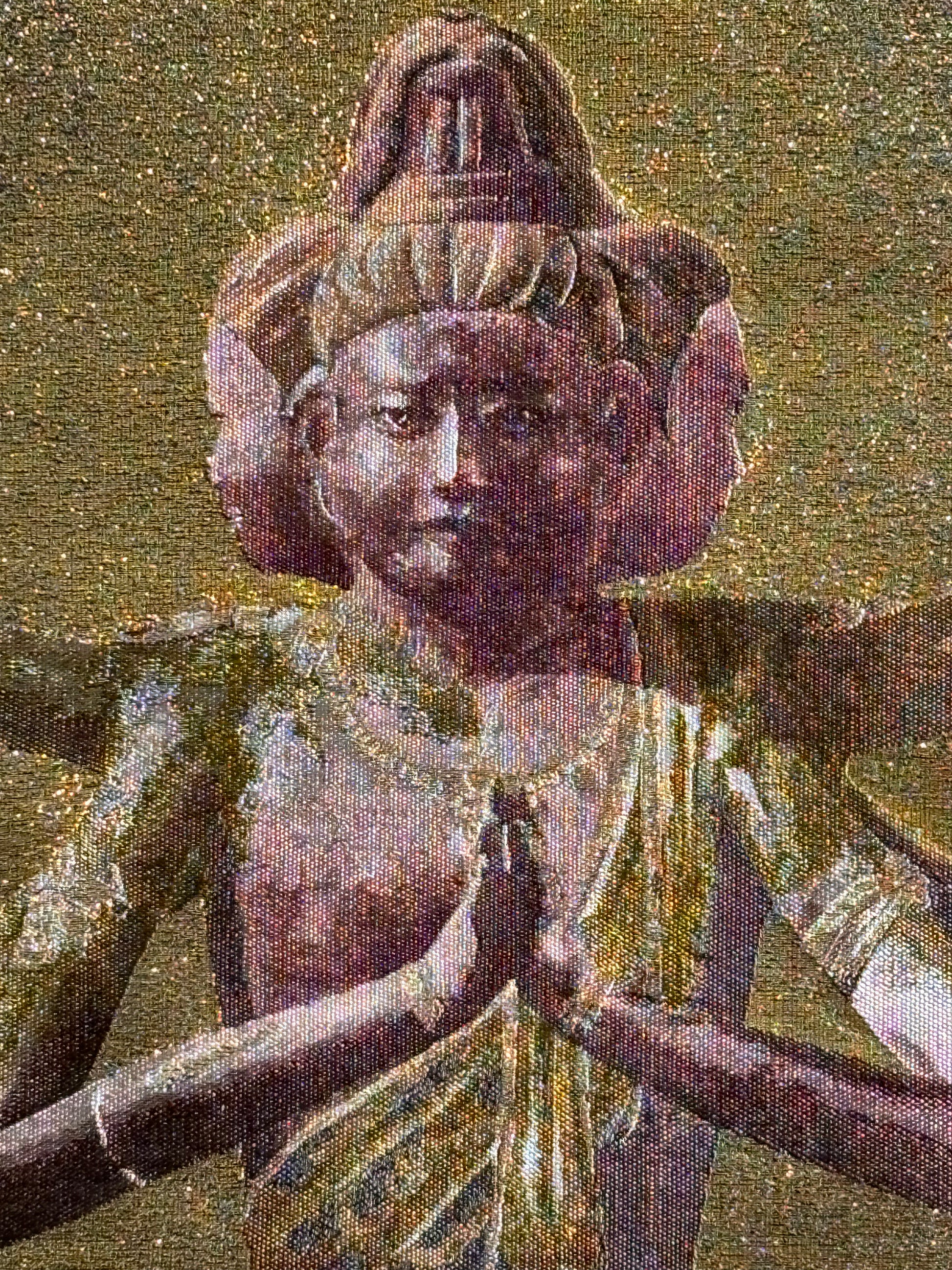 光背は平面的な本金箔と厚みのある金糸を使い分けることで立体感を出し、その輝きは実際の仏像では見ることができない、この作品ならではのものです。11色の色糸を様々に組み合わせ、仏像を立体的に二次元の織物の世界に織り上げた、西陣織の芸術性の高さを伺うことができる作品です。